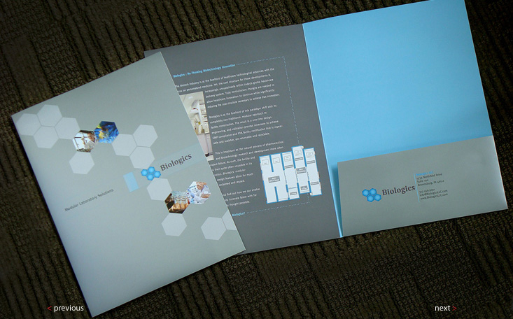 Biologics develops modular labs from common shipping containers. This pocket folder was created to reflect the high tech feel of a laboratory clean room and the molecular work done within.